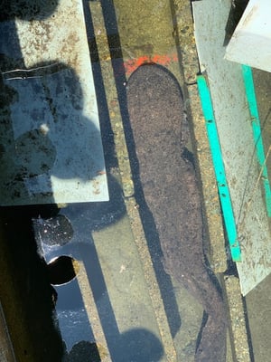 飼育プール内で出てきた日本産純正種のオオサンショウウオ。130㎝ぐらいある。