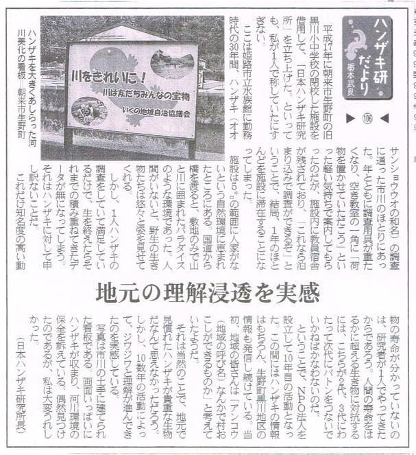 「ハンザキ研だより」は当研究所の故栃本武良所長が2013年11月から産経新聞の「但丹版」に概ね週一回掲載していた研究所周辺の自然を話題としたエッセイであり、全124回が掲載されました。栃本所長は200回を目標に執筆していましたが、2020年4月、志半ばで絶筆することとなりました。しかし産経新聞より提案を受け、「ハンザキ研の四季」として事務局員等で続けてゆくことになりました。