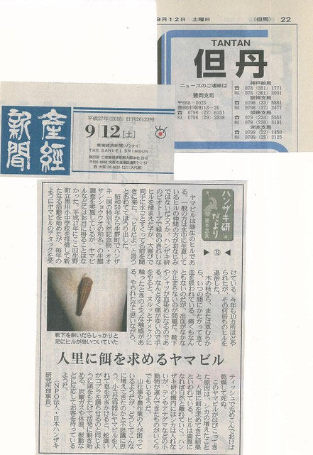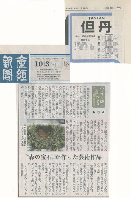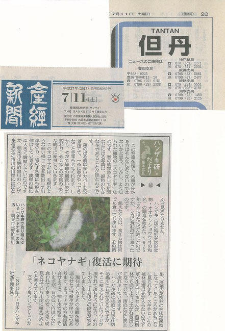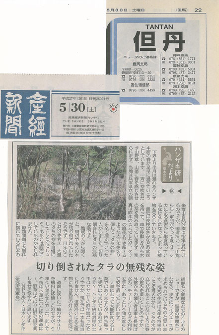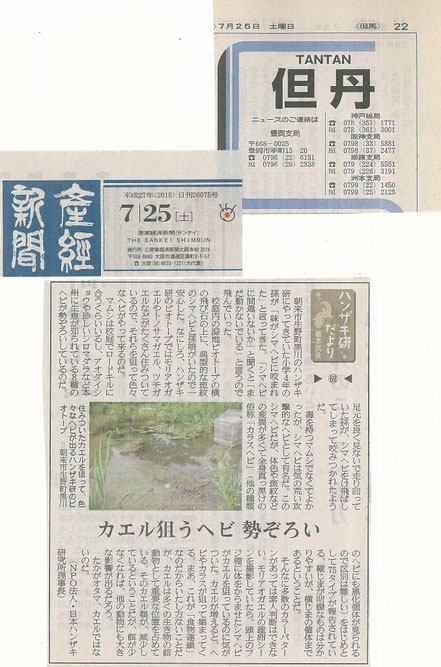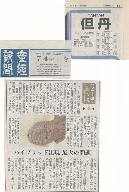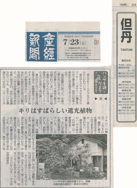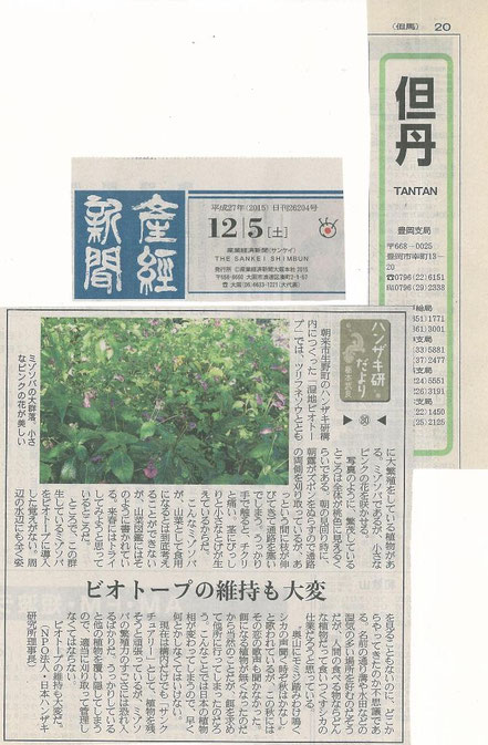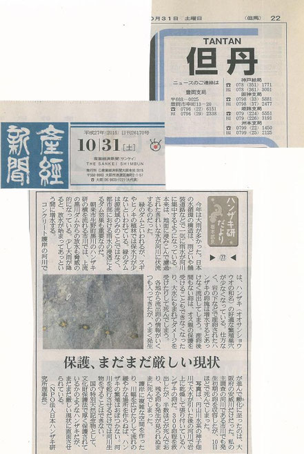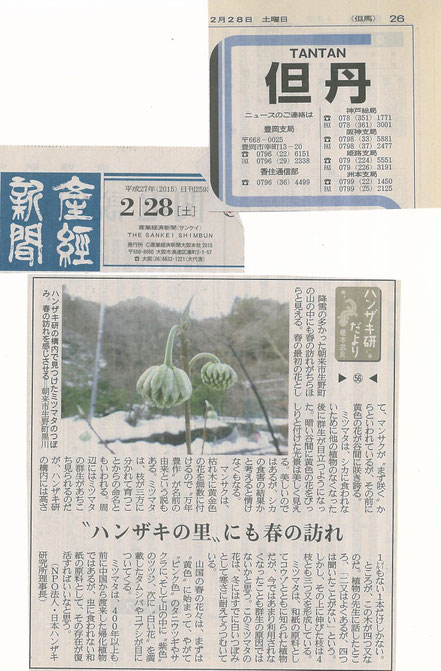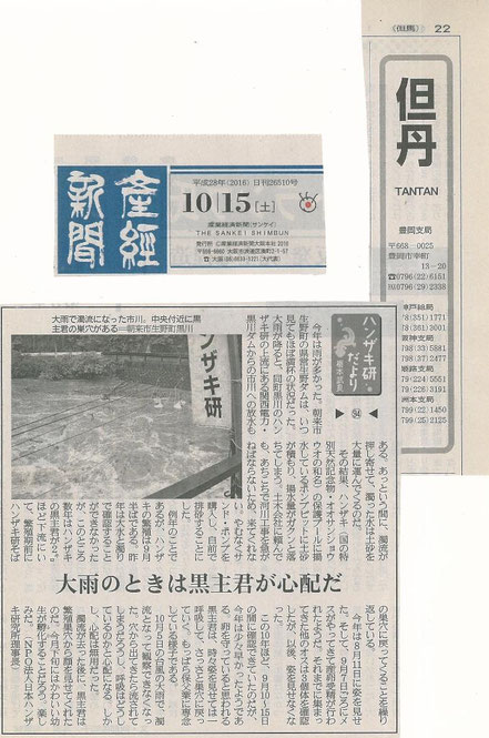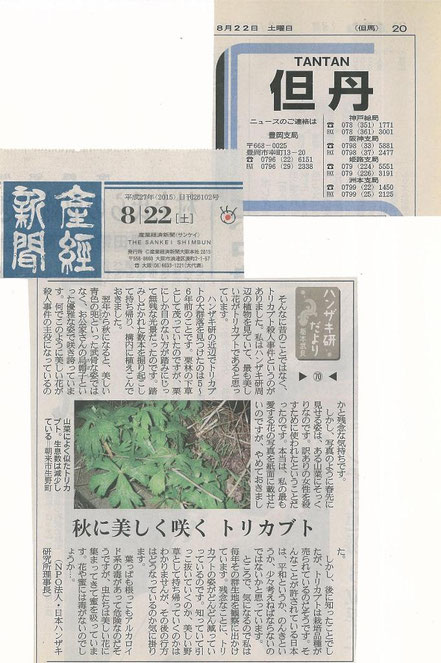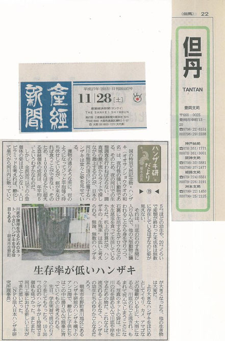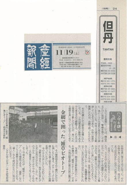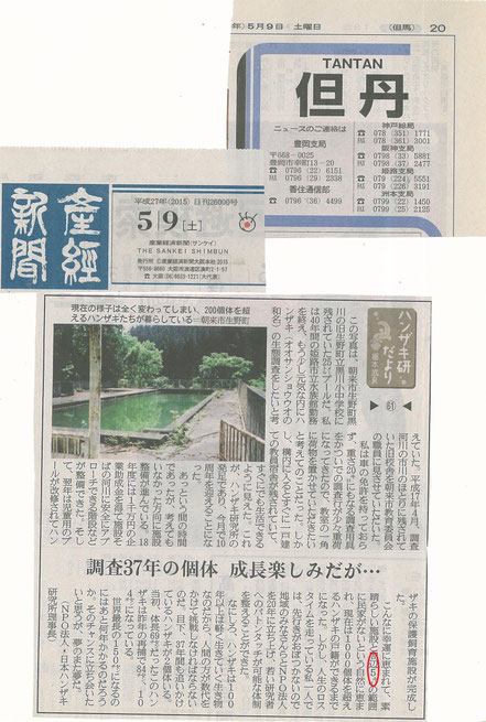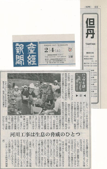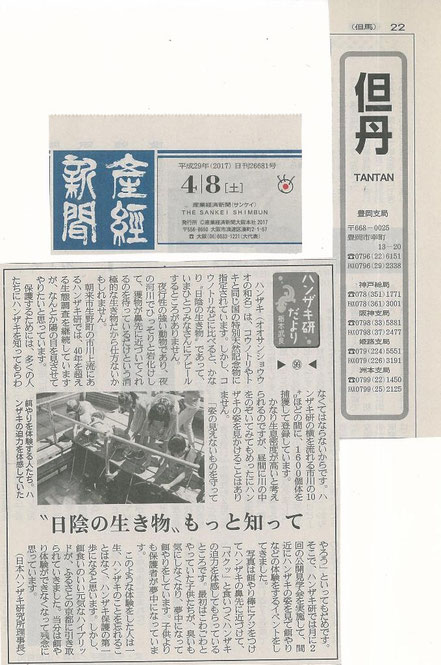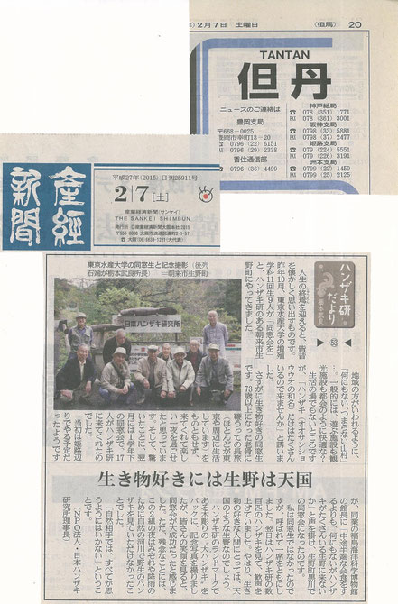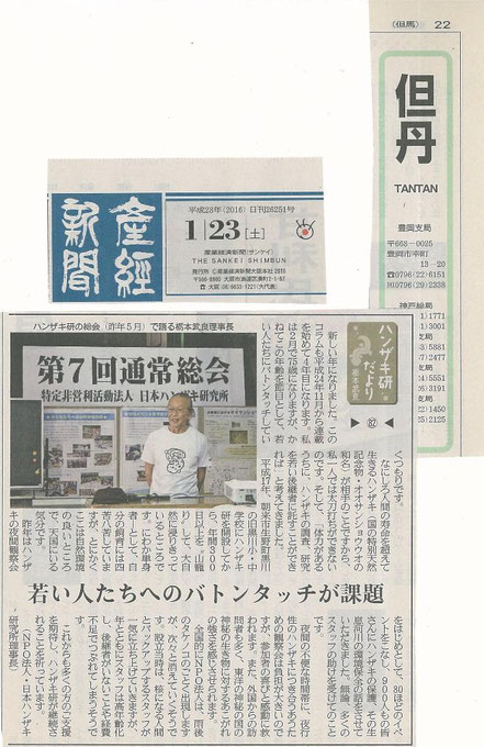 「ハンザキ研だより」は当研究所の故栃本武良所長が2013年11月から産経新聞の「但丹版」に概ね週一回掲載していた研究所周辺の自然を話題としたエッセイであり、全124回が掲載されました。栃本所長は200回を目標に執筆していましたが、2020年4月、志半ばで絶筆することとなりました。しかし産経新聞より提案を受け、「ハンザキ研の四季」として事務局員等で続けてゆくことになりました。